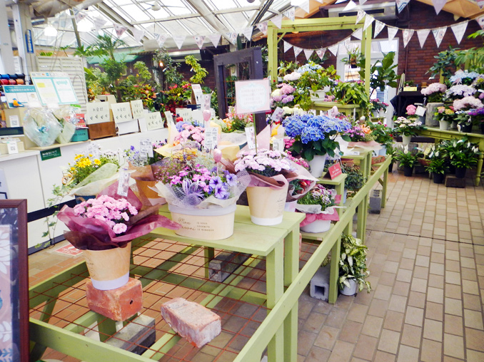 カーネーション、アジサイを中心にあいあいパーク自慢の花カゴのアレンジ等、華やかなお花からシックなお花まで取り揃えております。人気品種のバラ、マザーズジェムとマザーエレガンスも販売。