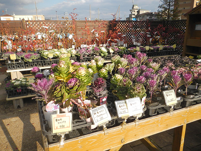 丸葉、踊り、黒葉等のアレンジや寄せ植えにもお勧めの葉牡丹を中心に、正月用の寄せ植えや、梅、松、などを展示即売。