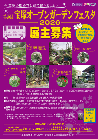 | お問合せ先 | ■あいあいパーク オープンガーデン係 TEL:0797-89-5933 FAX:0797-82-3571 または ■宝塚市役所 農の魅力創造課 TEL:0797-78-6071 |